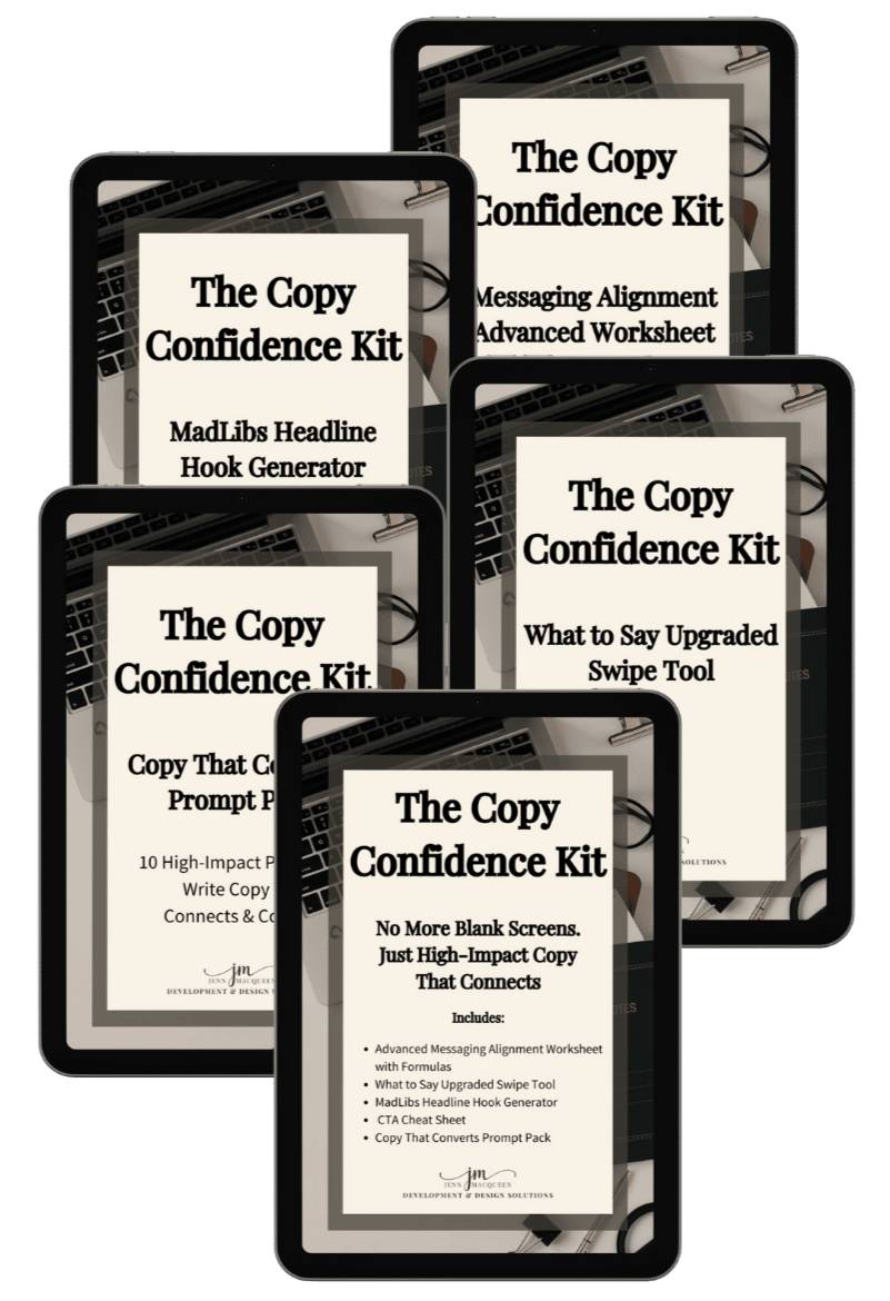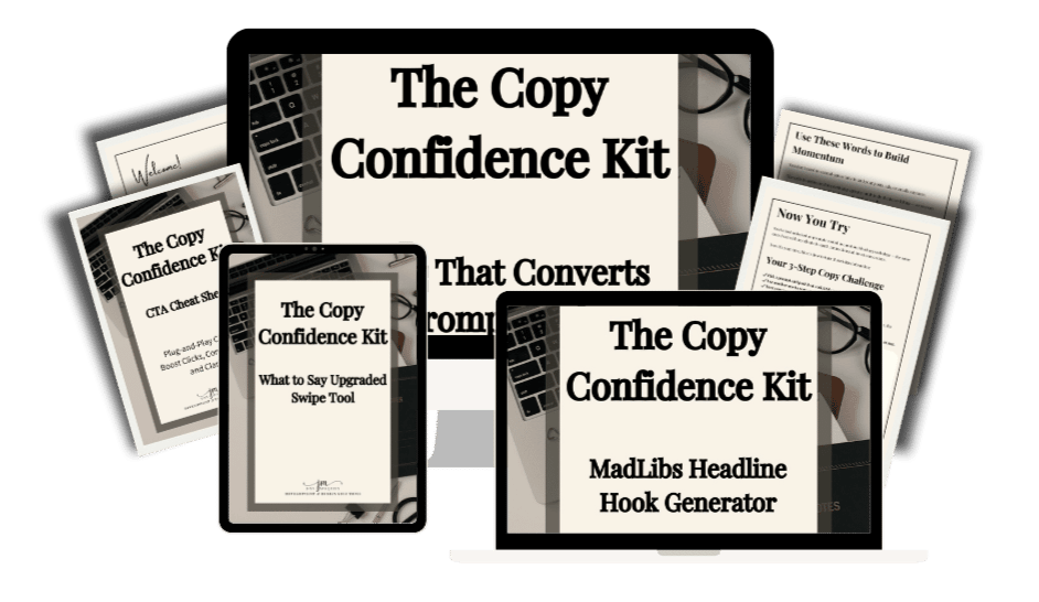 And now, I’m giving you the exact toolkit that helped me get there.The Copy Confidence Kit will show you exactly how to stop guessing, start writing with clarity, and finally say what your audience needs to hear to say yes.